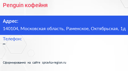 Penguin, кофейня по адресу 140104, Московская область, Раменское, Октябрьская, 1д в дальнейшем Организация, размещена в следующих категориях: