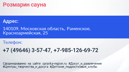 Розмарин, сауна по адресу 140109, Московская область, Раменское, Красноармейская, 25 в дальнейшем Организация, размещена в следующих категориях: