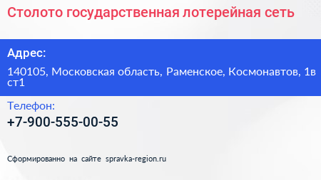 Столото, государственная лотерейная сеть по адресу 140105, Московская область, Раменское, Космонавтов, 1в ст1 в дальнейшем Организация, размещена в следующих категориях: