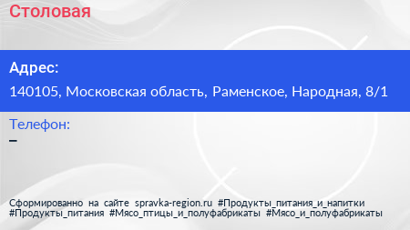 Столовая по адресу 140105, Московская область, Раменское, Народная, 8/1 в дальнейшем Организация, размещена в следующих категориях: