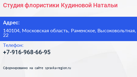 Студия флористики Кудиновой Натальи по адресу 140104, Московская область, Раменское, Высоковольтная, 22 в дальнейшем Организация, размещена в следующих категориях: