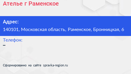 Ателье, г. Раменское по адресу 140101, Московская область, Раменское, Бронницкая, 6 в дальнейшем Организация, размещена в следующих категориях: