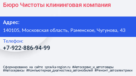 Бюро Чистоты, клининговая компания по адресу 140105, Московская область, Раменское, Чугунова, 43 в дальнейшем Организация, размещена в следующих категориях: