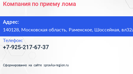 Компания по приему лома по адресу 140128, Московская область, Раменское, Шоссейная, вл32а в дальнейшем Организация, размещена в следующих категориях: