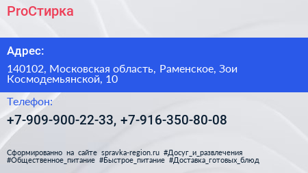 ProСтирка по адресу 140102, Московская область, Раменское, Зои Космодемьянской, 10 в дальнейшем Организация, размещена в следующих категориях: