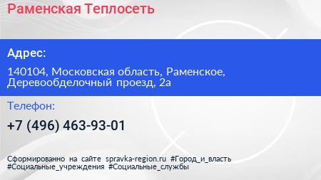 Раменская Теплосеть по адресу 140104, Московская область, Раменское, Деревообделочный проезд, 2а в дальнейшем Организация, размещена в следующих категориях: