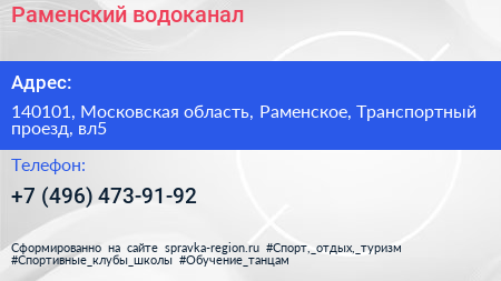 Раменский водоканал по адресу 140101, Московская область, Раменское, Транспортный проезд, вл5 в дальнейшем Организация, размещена в следующих категориях: