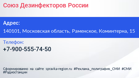 Союз Дезинфекторов России по адресу 140101, Московская область, Раменское, Коминтерна, 15 в дальнейшем Организация, размещена в следующих категориях: