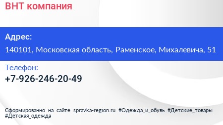 BHT, компания по адресу 140101, Московская область, Раменское, Михалевича, 51 в дальнейшем Организация, размещена в следующих категориях: