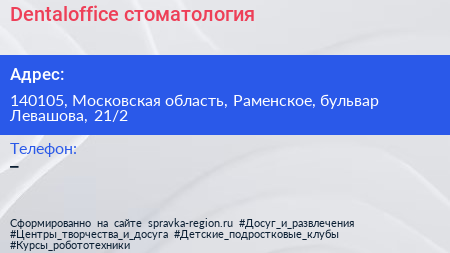 Dentaloffice, cтоматология по адресу 140105, Московская область, Раменское, бульвар Левашова, 21/2 в дальнейшем Организация, размещена в следующих категориях: