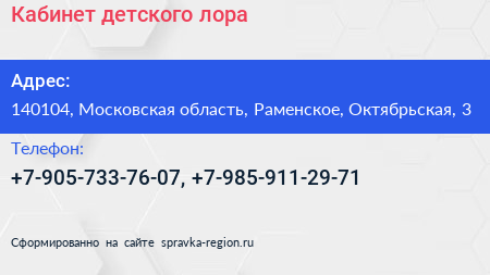 Кабинет детского лора по адресу 140104, Московская область, Раменское, Октябрьская, 3 в дальнейшем Организация, размещена в следующих категориях: