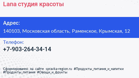 Lana, студия красоты по адресу 140103, Московская область, Раменское, Крымская, 12 в дальнейшем Организация, размещена в следующих категориях: