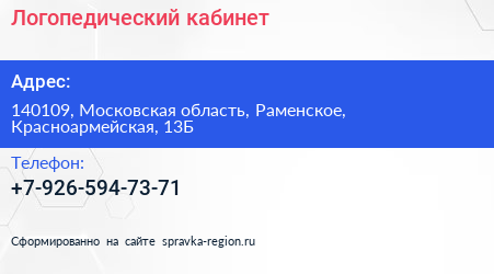 Логопедический кабинет по адресу 140109, Московская область, Раменское, Красноармейская, 13Б в дальнейшем Организация, размещена в следующих категориях: