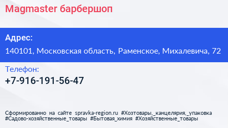 Magmaster, барбершоп по адресу 140101, Московская область, Раменское, Михалевича, 72 в дальнейшем Организация, размещена в следующих категориях: