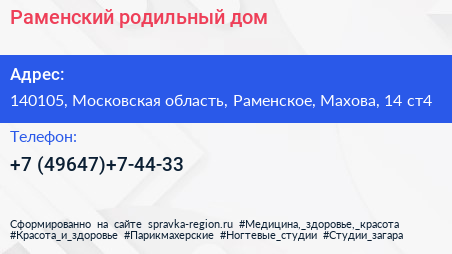 Раменский родильный дом по адресу 140105, Московская область, Раменское, Махова, 14 ст4 в дальнейшем Организация, размещена в следующих категориях: