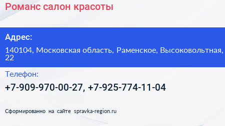 Романс, салон красоты по адресу 140104, Московская область, Раменское, Высоковольтная, 22 в дальнейшем Организация, размещена в следующих категориях: