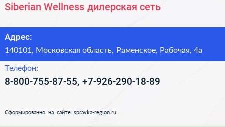 Siberian Wellness, дилерская сеть по адресу 140101, Московская область, Раменское, Рабочая, 4а в дальнейшем Организация, размещена в следующих категориях: