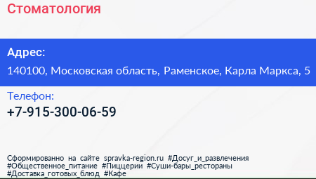 Стоматология по адресу 140100, Московская область, Раменское, Карла Маркса, 5 в дальнейшем Организация, размещена в следующих категориях:
