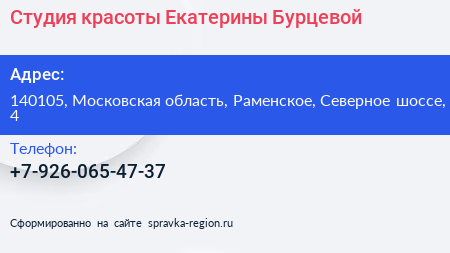Студия красоты Екатерины Бурцевой по адресу 140105, Московская область, Раменское, Северное шоссе, 4 в дальнейшем Организация, размещена в следующих категориях: