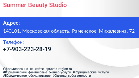Summer Beauty Studio по адресу 140101, Московская область, Раменское, Михалевича, 72 в дальнейшем Организация, размещена в следующих категориях: