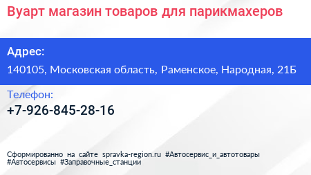 Вуарт, магазин товаров для парикмахеров по адресу 140105, Московская область, Раменское, Народная, 21Б в дальнейшем Организация, размещена в следующих категориях: