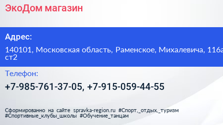 ЭкоДом, магазин по адресу 140101, Московская область, Раменское, Михалевича, 116а ст2 в дальнейшем Организация, размещена в следующих категориях: