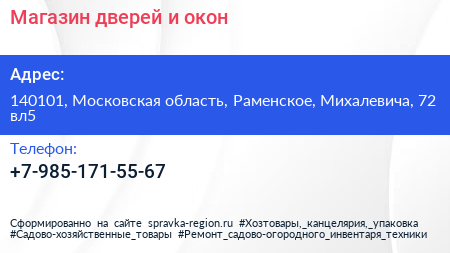 Магазин дверей и окон по адресу 140101, Московская область, Раменское, Михалевича, 72 вл5 в дальнейшем Организация, размещена в следующих категориях: