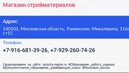 Магазин стройматериалов по адресу 140101, Московская область, Раменское, Михалевича, 116а ст15 в дальнейшем Организация, размещена в следующих категориях: