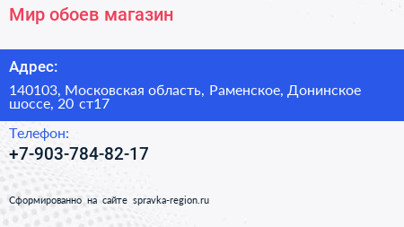 Мир обоев, магазин по адресу 140103, Московская область, Раменское, Донинское шоссе, 20 ст17 в дальнейшем Организация, размещена в следующих категориях: