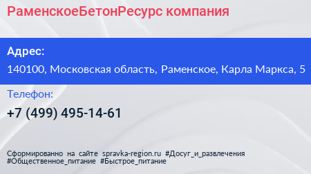 РаменскоеБетонРесурс, компания по адресу 140100, Московская область, Раменское, Карла Маркса, 5 в дальнейшем Организация, размещена в следующих категориях: