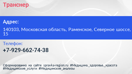 Транснер по адресу 140103, Московская область, Раменское, Северное шоссе, 15 в дальнейшем Организация, размещена в следующих категориях: