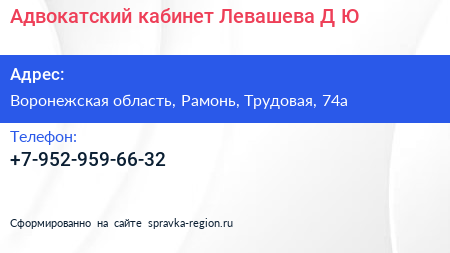Адвокатский кабинет Левашева Д.Ю. по адресу Воронежская область, Рамонь, Трудовая, 74а в дальнейшем Организация, размещена в следующих категориях: