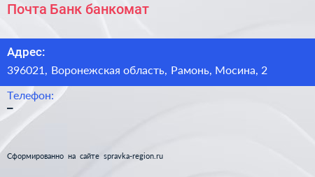 Почта Банк, банкомат по адресу 396021, Воронежская область, Рамонь, Мосина, 2 в дальнейшем Организация, размещена в следующих категориях: