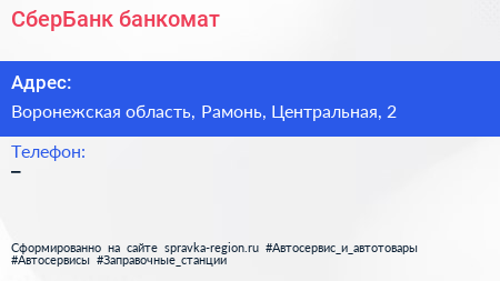 СберБанк, банкомат по адресу Воронежская область, Рамонь, Центральная, 2 в дальнейшем Организация, размещена в следующих категориях:
