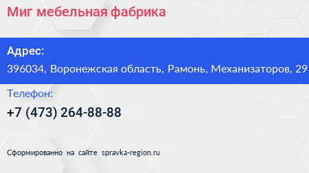Миг, мебельная фабрика по адресу 396034, Воронежская область, Рамонь, Механизаторов, 29 в дальнейшем Организация, размещена в следующих категориях:
