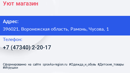 Уют, магазин по адресу 396021, Воронежская область, Рамонь, Чусова, 1 в дальнейшем Организация, размещена в следующих категориях: