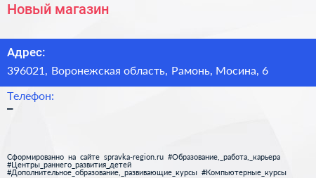 Новый, магазин по адресу 396021, Воронежская область, Рамонь, Мосина, 6 в дальнейшем Организация, размещена в следующих категориях: