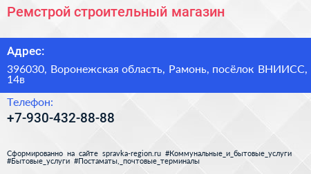 Ремстрой, строительный магазин по адресу 396030, Воронежская область, Рамонь, посёлок ВНИИСС, 14в в дальнейшем Организация, размещена в следующих категориях: