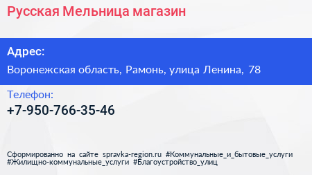 Русская Мельница, магазин по адресу Воронежская область, Рамонь, улица Ленина, 78 в дальнейшем Организация, размещена в следующих категориях: