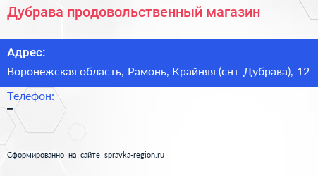 Дубрава, продовольственный магазин по адресу Воронежская область, Рамонь, Крайняя (снт Дубрава), 12 в дальнейшем Организация, размещена в следующих категориях: