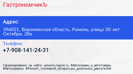 ГастрономчикЪ по адресу 396021, Воронежская область, Рамонь, улица 50 лет Октября, 28а в дальнейшем Организация, размещена в следующих категориях:
