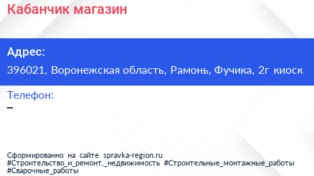 Кабанчик, магазин по адресу 396021, Воронежская область, Рамонь, Фучика, 2г киоск в дальнейшем Организация, размещена в следующих категориях: