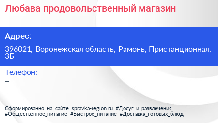 Любава, продовольственный магазин по адресу 396021, Воронежская область, Рамонь, Пристанционная, 3Б в дальнейшем Организация, размещена в следующих категориях: