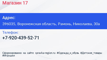 Магазин №17 по адресу 396035, Воронежская область, Рамонь, Николаева, 30а в дальнейшем Организация, размещена в следующих категориях: