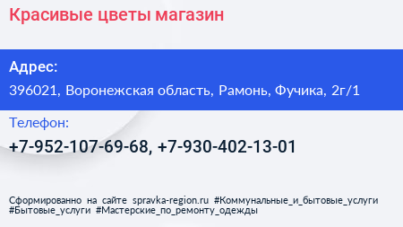 Красивые цветы, магазин по адресу 396021, Воронежская область, Рамонь, Фучика, 2г/1 в дальнейшем Организация, размещена в следующих категориях:
