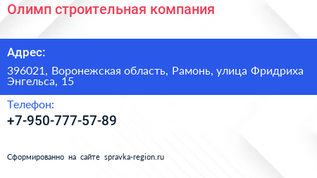 Олимп, строительная компания по адресу 396021, Воронежская область, Рамонь, улица Фридриха Энгельса, 15 в дальнейшем Организация, размещена в следующих категориях: