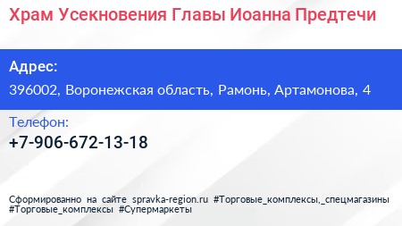 Храм Усекновения Главы Иоанна Предтечи по адресу 396002, Воронежская область, Рамонь, Артамонова, 4 в дальнейшем Организация, размещена в следующих категориях: