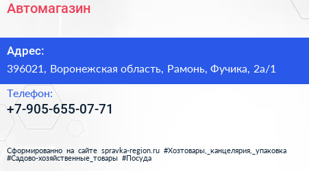 Автомагазин по адресу 396021, Воронежская область, Рамонь, Фучика, 2а/1 в дальнейшем Организация, размещена в следующих категориях: