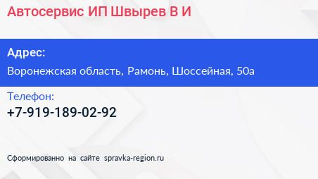 Автосервис, ИП Швырев В.И. по адресу Воронежская область, Рамонь, Шоссейная, 50а в дальнейшем Организация, размещена в следующих категориях: