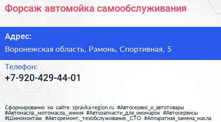 Форсаж, автомойка самообслуживания по адресу Воронежская область, Рамонь, Спортивная, 5 в дальнейшем Организация, размещена в следующих категориях: